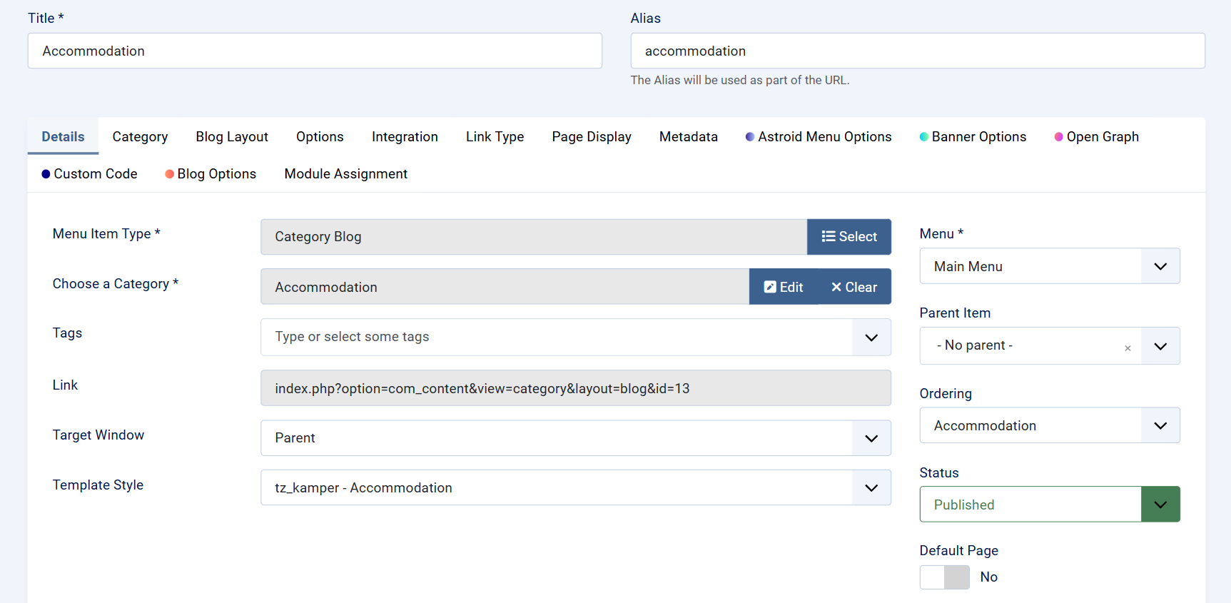 Create a menu item for the Accommodation page and assign it to the corresponding template style.