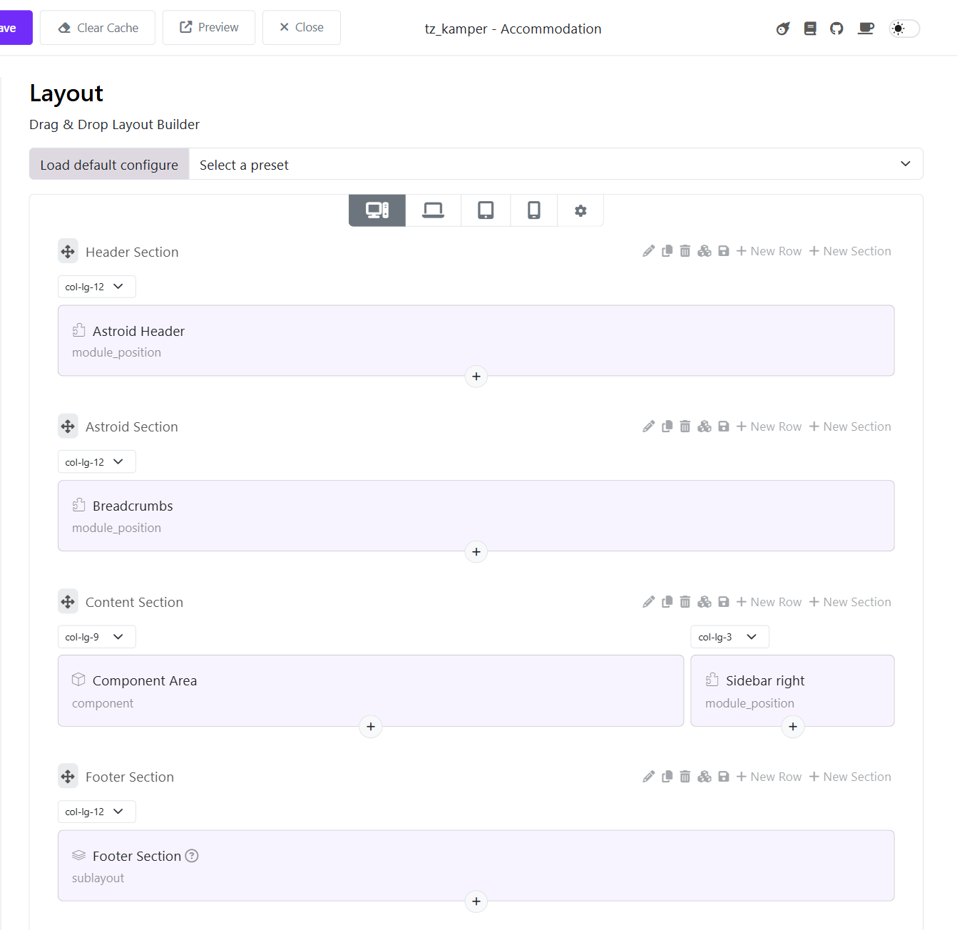 To edit the home page content, please go to Site template styles > edit ex: **tz\_kamper - Accommodation > Layout**. Here you can edit element's content in the layout.&#x20;